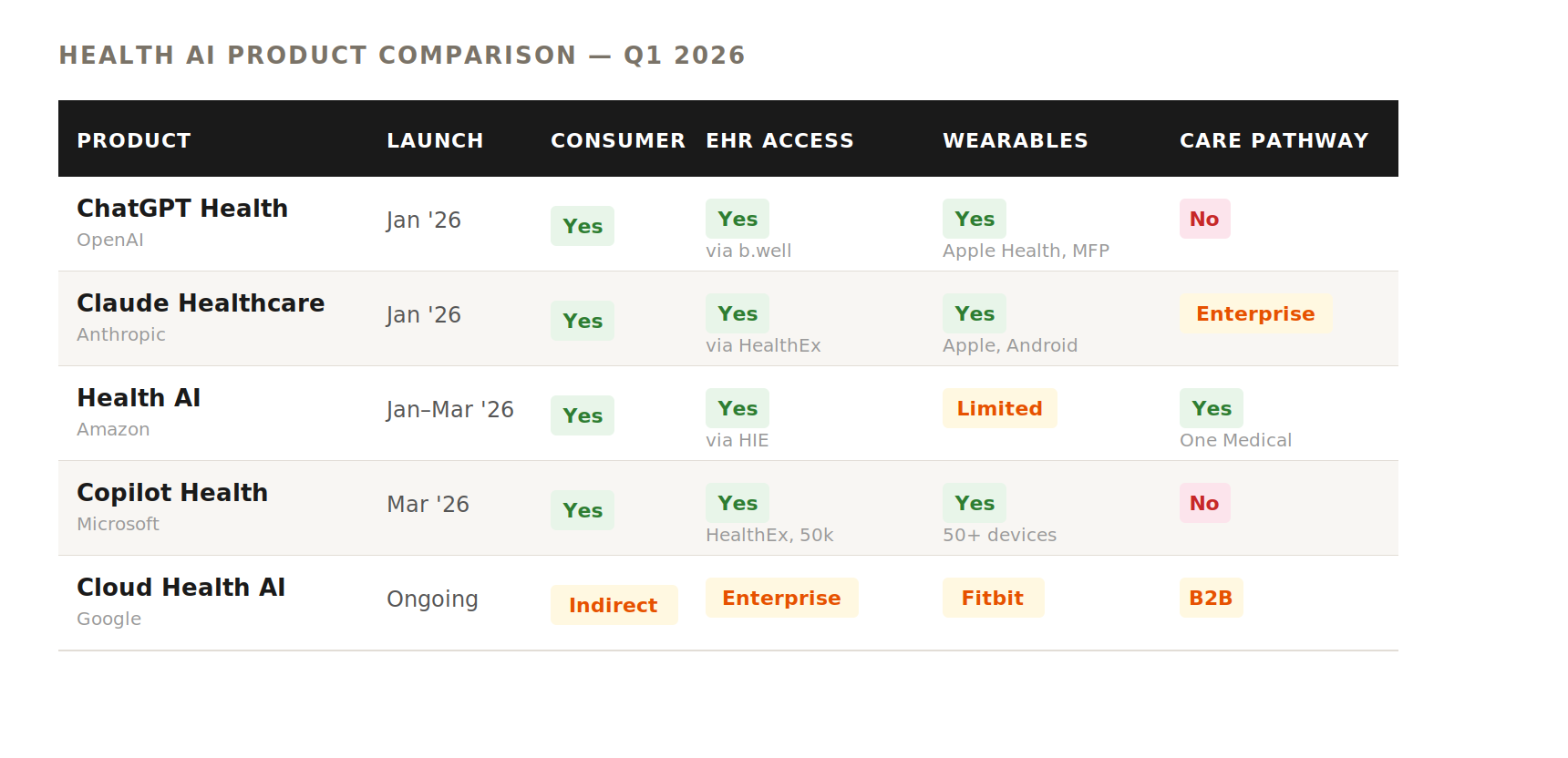 Google, Apple, Amazon, and Microsoft are each approaching healthcare AI from fundamentally different positions, with different data moats, different regulatory strategies, and different product visions. I wanted to assess what is actually happening beneath the press releases and what it means for the rest of us building in this space.